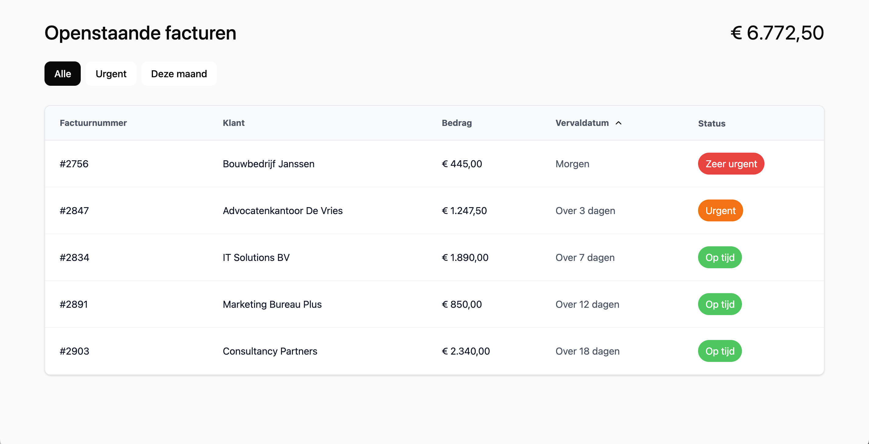 Variant 1 toont urgentie subtiel: een klein oranje bolletje bij facturen die binnenkort vervallen. Clean, rustig, netjes. Alleen… als je gebruiker vooral stress heeft en snel wil handelen, is “subtiel” soms gewoon een synoniem voor “onzichtbaar”. Variant 2 doet het omgekeerde: grote badges, rood-oranje-groen, urgency alsof je inbox een kerstboom is. Duidelijker, ja, maar bij veel facturen verdwijnt de essentie mogelijks toch. Variant 3 giet alles dan weer in een tijdlijn, wat ons laat afvragen of dit nog een facturatietool is of een visueel experiment.